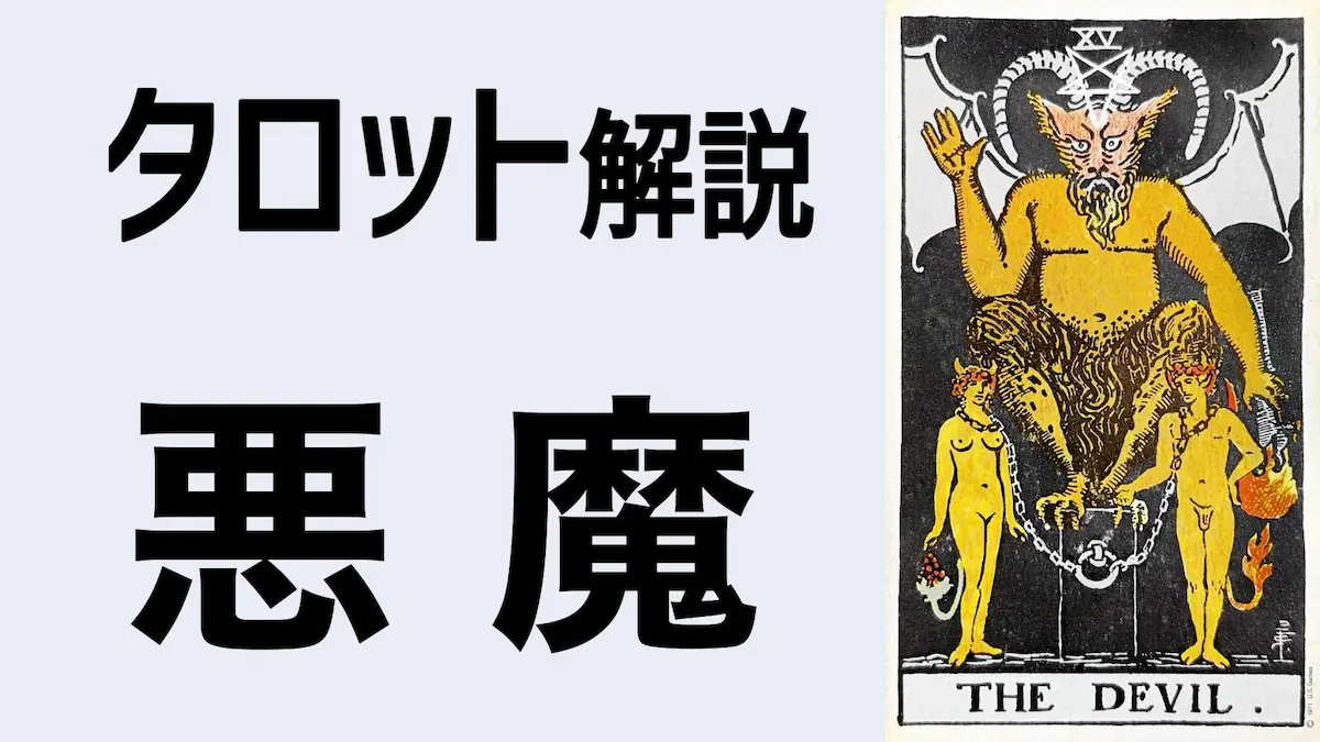 上半身が人間、下半身が獣、顔は山羊、頭に逆五芒星(金貨の逆位置)、コウモリの羽根を持つ悪魔と、鎖につながれた裸の男女がいます。